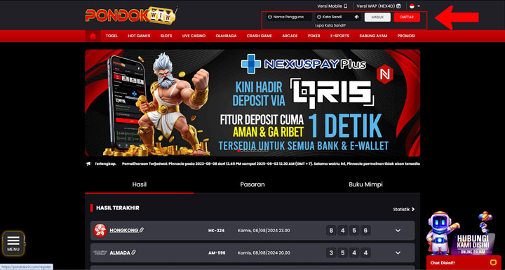 - Masuk / Login: Setelah mengisi kolom dengan lengkap dan benar, klik tombol Masuk / Login untuk masuk kedalam akun situs Pondokwin